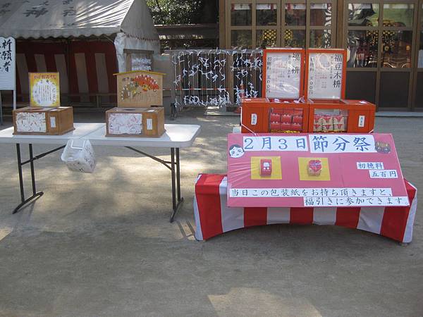 通常神社裡面都會有祭典,然後會有人在台上灑一包包的小豆子給民眾。