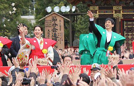 這就是今年綾瀨遙和西島大叔在千葉成田山新勝寺灑豆給民眾的圖片。